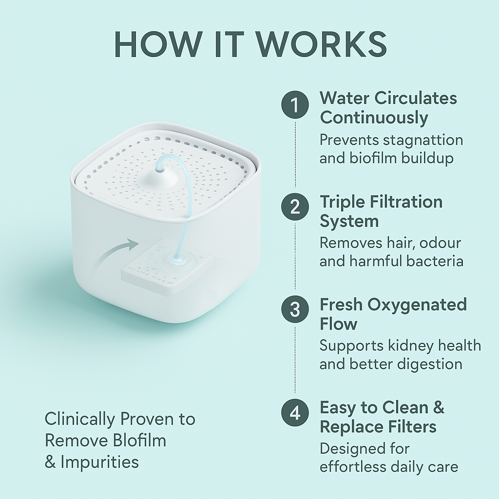 We break this heartbreaking cycle. Our fountain features a proven anti-bacterial coating to actively prevent biofilm from ever forming. The continuous, flowing water mimics a natural stream, instantly triggering your cat's "safe water" instincts. The result is effortless, consistent hydration. Stop worrying about blockages and huge vet bills—give your cat the clean water they instinctively trust.